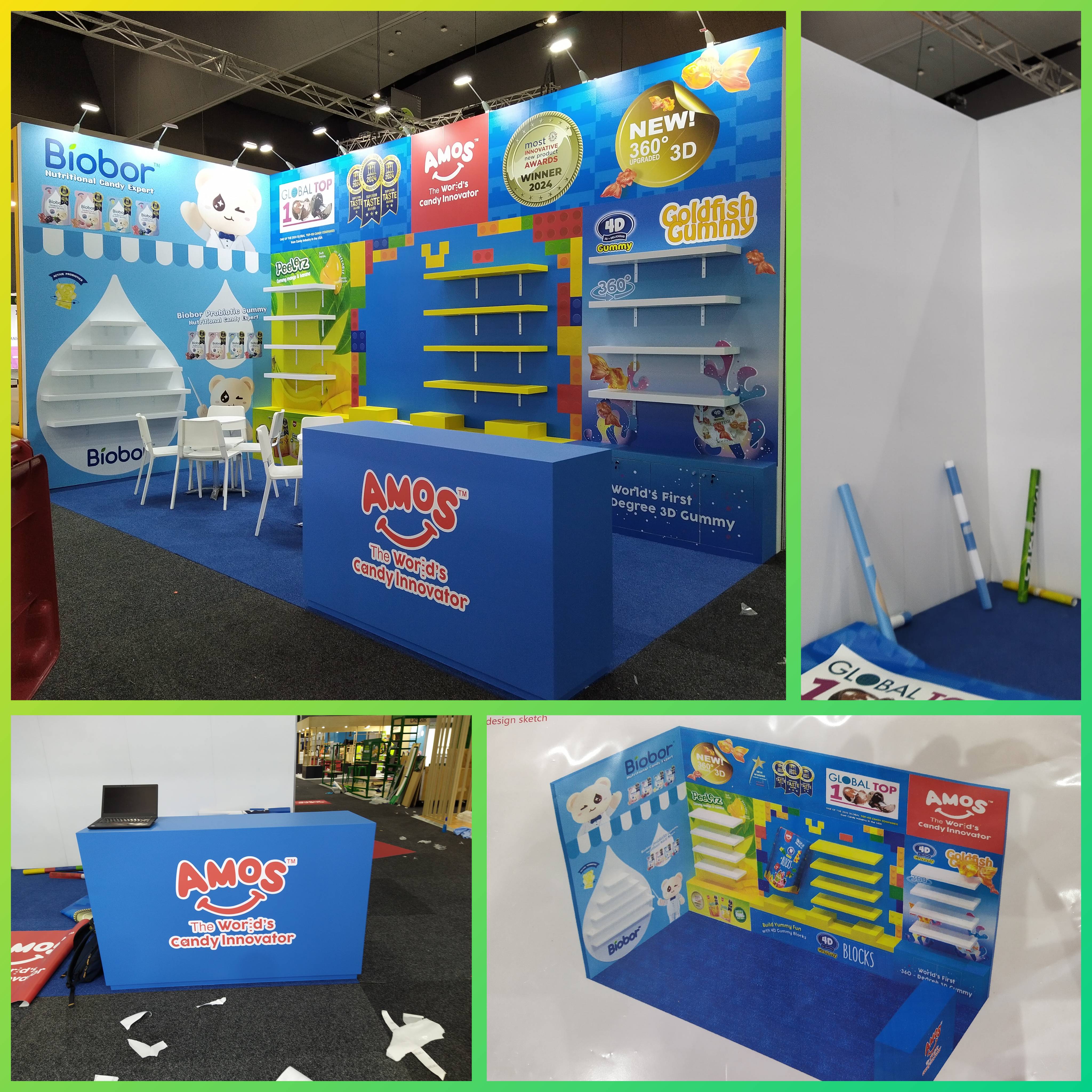 Custom booth design, woodworking, printing, lighting, AV setup, installation & dismantling.